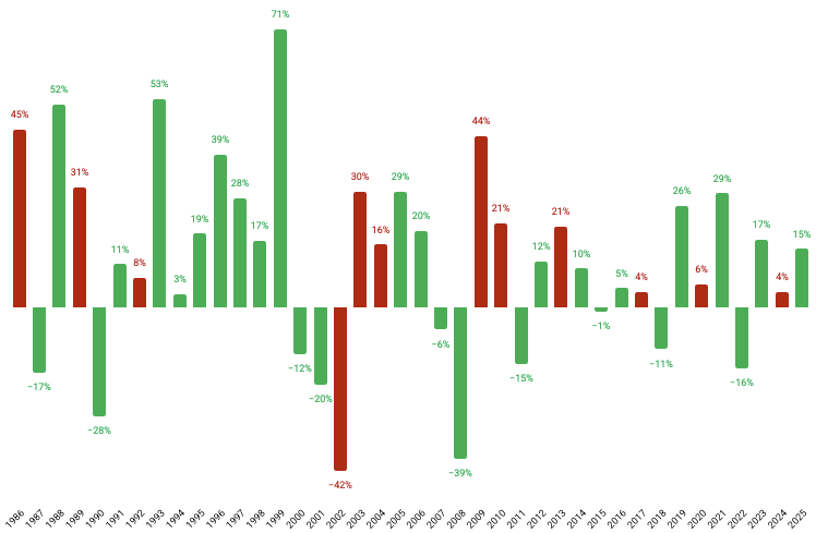 Så vad är smart att göra just nu? Läs på, försök förstå, logga in och titta, kanske sura lite över att man inte väntade några dagar med att köpa för sitt månadssparande, för att sen komma på att juste – jag är ju en person som månadssparar på börsen. Det är ju toppen, och såna här dagar är en del av kostnaden för att få möjlighet att ta del av börsens långsiktiga värdeskapande. Kolla på den här grafen nu och påminn dig själv om att börsen inte går upp 7 procent linjärt per år, utan den går oftare upp än ner och du gör helt rätt som har dina långsiktiga pengar i marknaden. OMXS30 sen 1986.