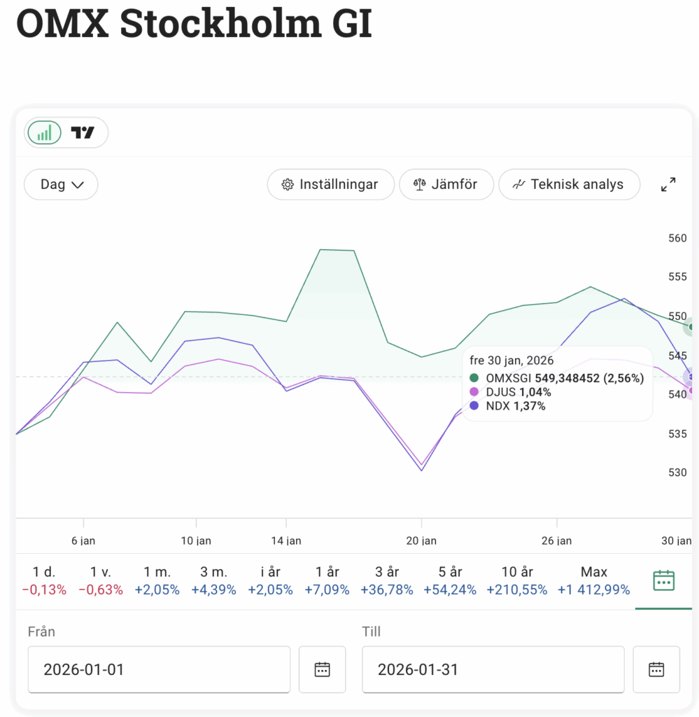 Det blev en händelserik, och något stökig, start på börsåret 2026. Men trots det blev det en positiv börsmånad för breda Stockholmsbörsen (OMXSGI) som steg ca 2,2%. Börsens mindre bolag har det dock fortsatt kämpigt, inte minst efter Trump återigen hotat om tullar som i sin tur ökar osäkerheten kring konjunkturåterhämtningen. Stockholmsbörsens småbolagsindex hade en nedgång på ca -0,6% medan storbolagsindex hade en uppgång på hela 5%.
