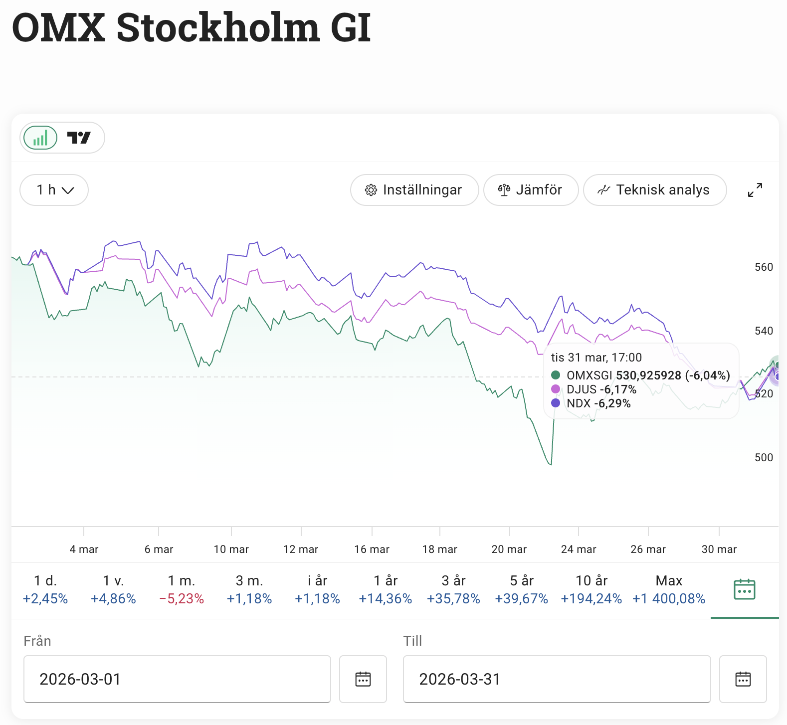 Börsrallyt som inledde året på Stockholmsbörsen(OMXSGI) vände tvärt i mars och har med runt 7,5% till följd av kriget i Mellanöstern och det rusande oljepriset. Oron och osäkerheten har satt hela det ekonomiska läget i gungning och har bland annat lett till en helomvändning av ränteläget och ökade osäkerheten i tillväxtprognoserna. Samtidigt har bolagens resultat inte påverkats ännu, och det finns fortfarande ett hopp på marknaderna om att kriget ska bli kortvarigt och de negativa konsekvenserna begränsade. Men, nu stundar rapportperioden för årets första kvartal och då kommer vi få se mer svart på vitt hur bolagen påverkats hittills.