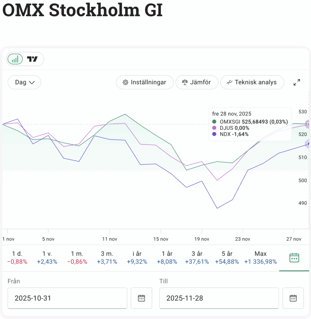 Börsrallyt från förra månaden fick mer eller mindre ett tvärstopp i november. Hela månaden har präglats av en ängslighet och ett påtagligt bakslag till följd av växande oro kring AI-sektorns höga värderingar. Stockholmsbörsen (OMXSGI) avslutade till sist berg-och-dalbansmånaden med en utveckling på +/-0%.