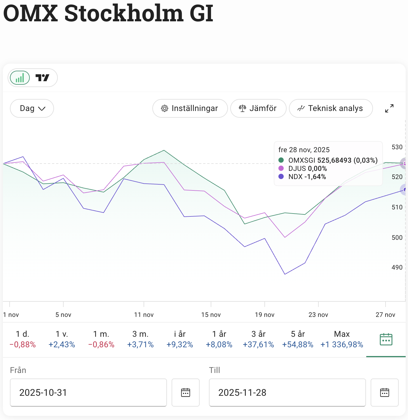 Börsrallyt från förra månaden fick mer eller mindre ett tvärstopp i november. Hela månaden har präglats av en ängslighet och ett påtagligt bakslag till följd av växande oro kring AI-sektorns höga värderingar. Stockholmsbörsen (OMXSGI) avslutade till sist berg-och-dalbansmånaden med en utveckling på +/-0%.