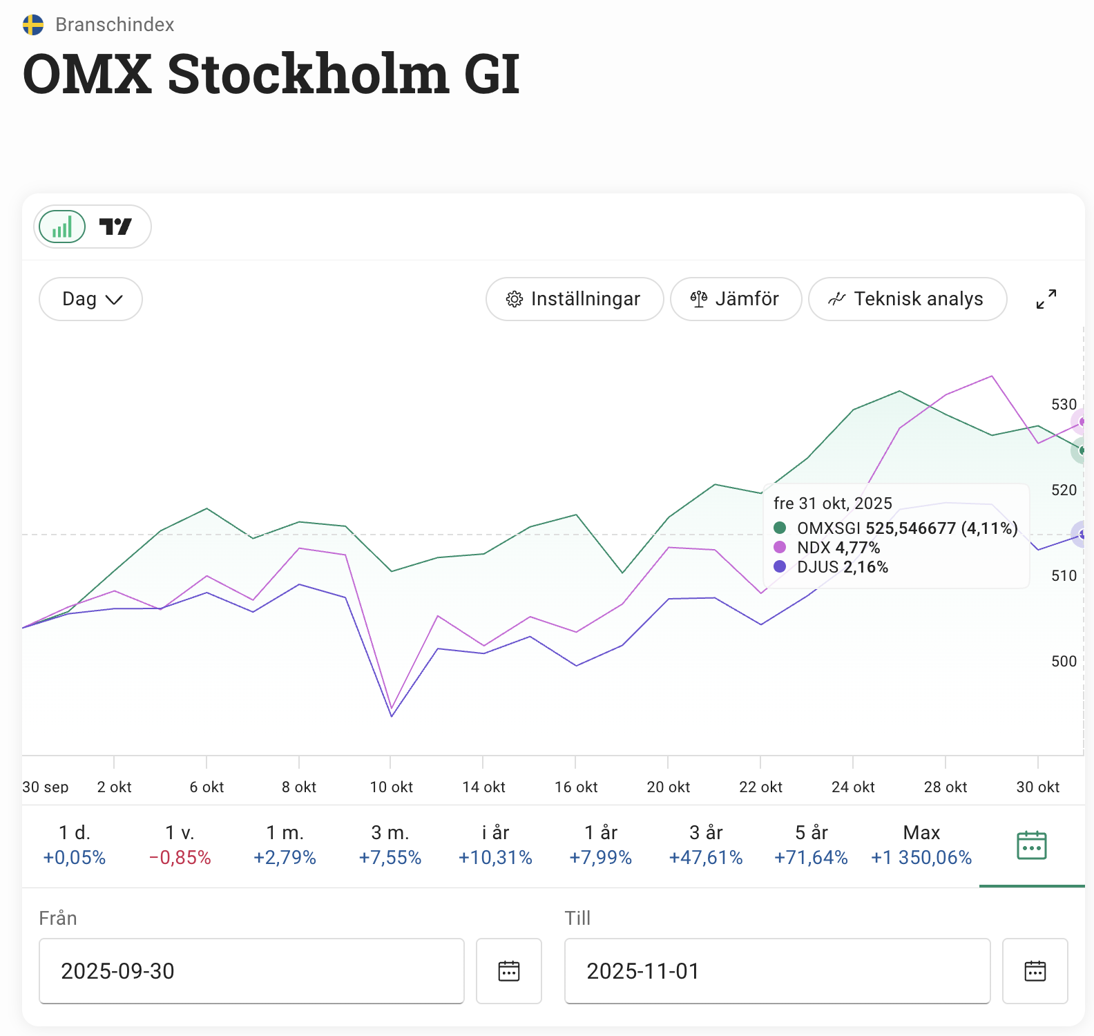 Efter en lång period av försiktiga sidledesrörelser på Stockholmsbörsen (OMXSGI) har oktober levererat en väldigt stark börsmånad med en uppgång på 4,1 procent. Även amerikanska teknikindexet Nasdaq 100 har haft en stark framfart under månaden med närmare 4,8 procent uppgång. Något sämre har det gått för breda amerikanska index DJ USA som stigit drygt 2,2 procent.