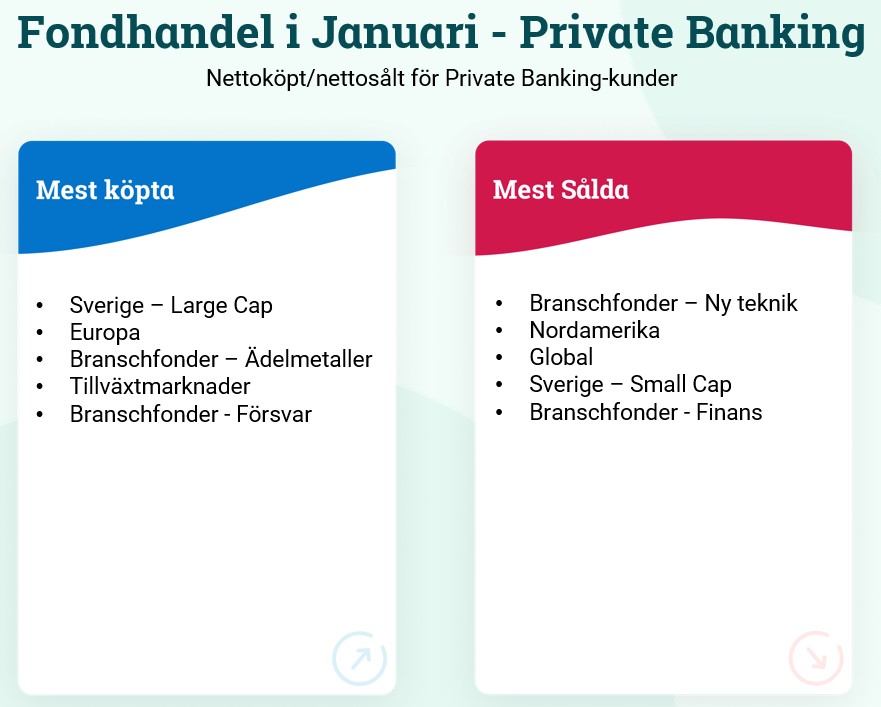 På fondsidan ser vi en tydlig spegling av aktiehandeln. Private Banking-kunderna säljer av USA och Techfonder för att istället vikta om mot Svenska storbolag och Europa. Avanza Zero, SEB Swedish Value Fund och Plus Allabolag Sverige Index toppar köplistan.